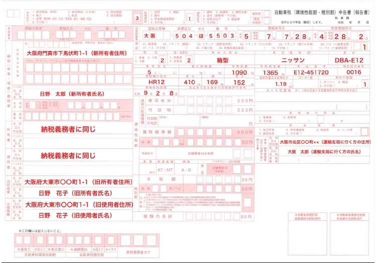 自動車税申告書につきましては、車検証の内容と新旧所有者を記入いたします。
