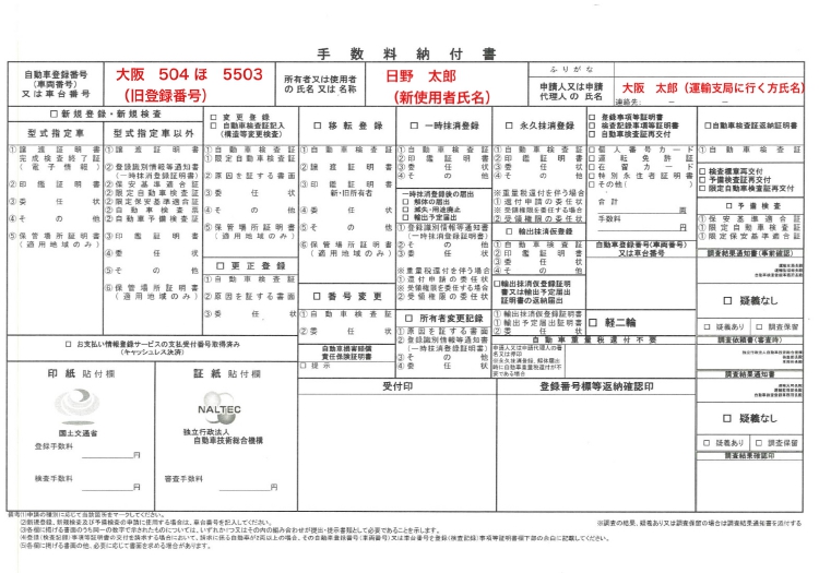 所有者氏名、旧ナンバープレート番号、申請者の名前を書いて500円の登録印紙を貼ります。