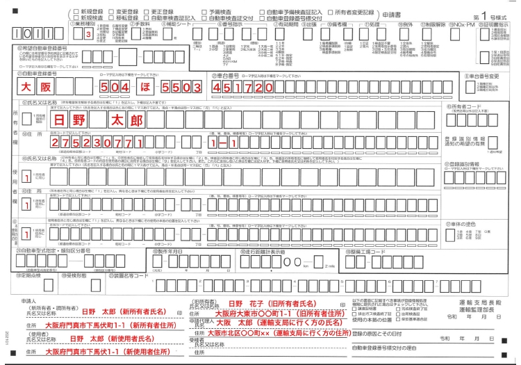旧のプレート番号、車体番号、新しい所有者の名前、住所コードを記入します。 (住所コード検索については運輸支局に一覧表が置いています)