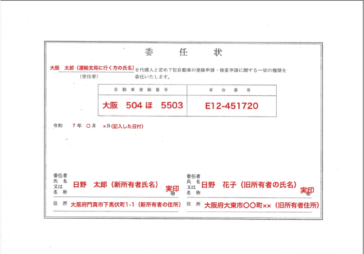 委任状は旧ナンバーと車体番号を記入し印鑑証明通りに住所氏名を記入します。
