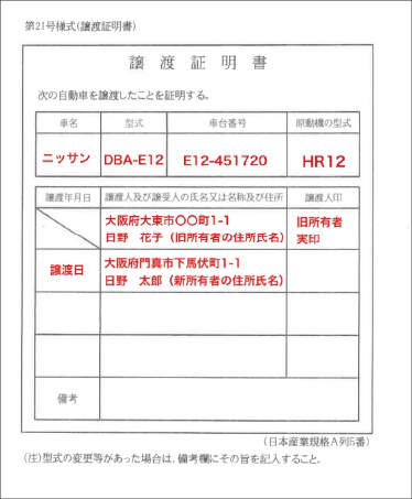 譲渡証明には車郷名、型式、車体番号、原動機の型式を記載し、上段に旧所有者、その下に新所有者の住所氏名を記入します。